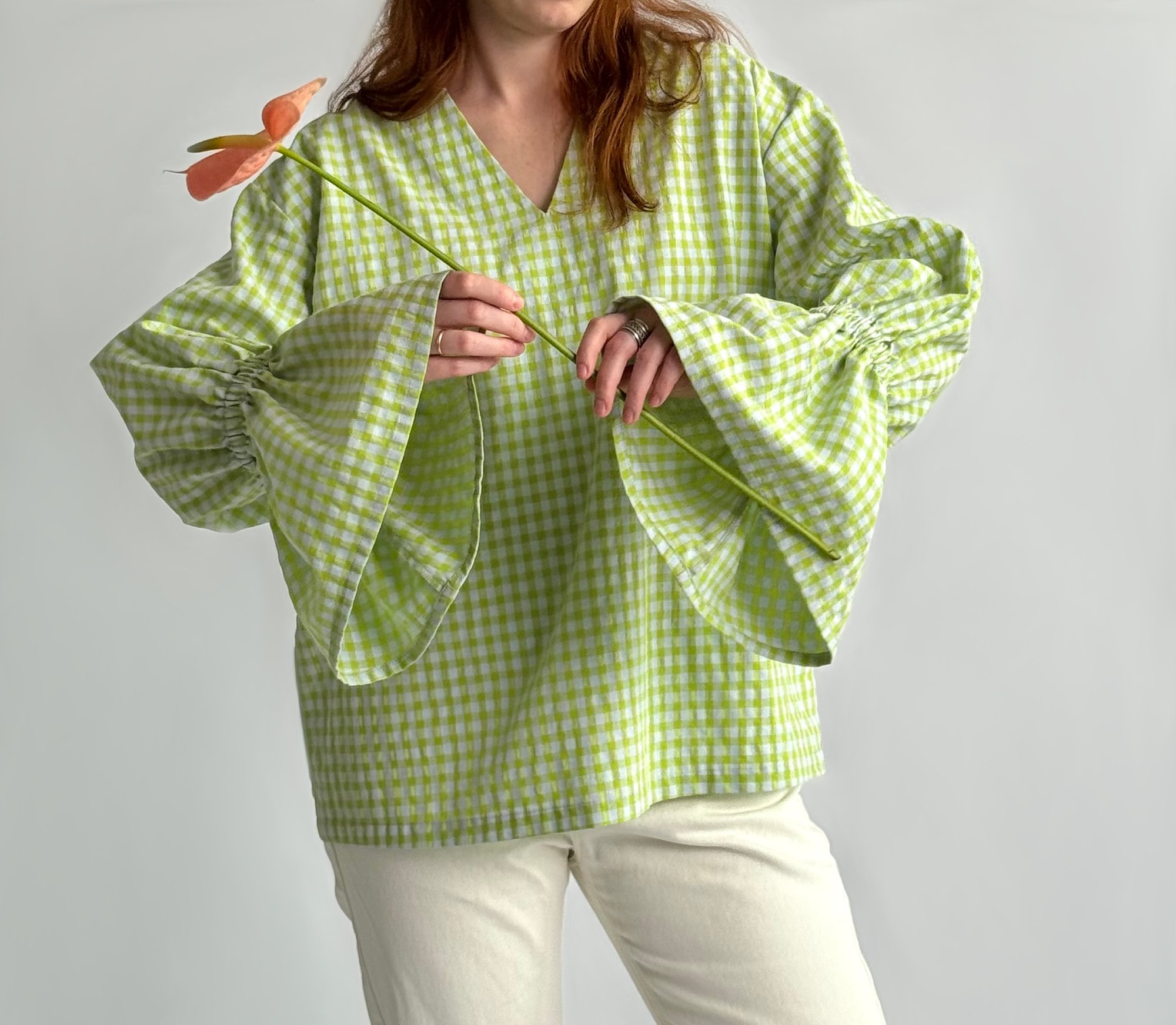 Cotton oversized blouse with bell sleeves in color mohito green (Vichy Check).